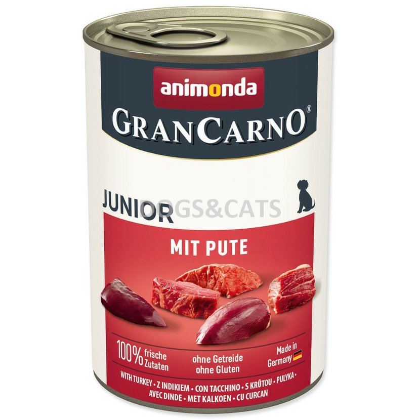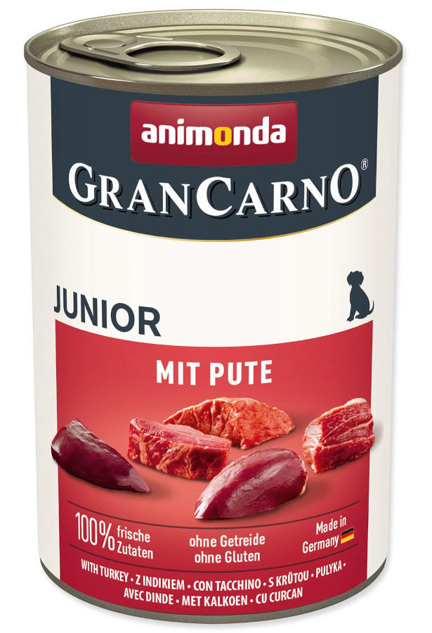 Kompletní vyvážené konzervované krmivo ANIMONDA Gran Carno Junior s krůtím masem pro štěňata obsahuje maso ve formě malých kousků se zachovanou přirozenou strukturou, bez umělých dochucovadel, barviv a konzervantů.