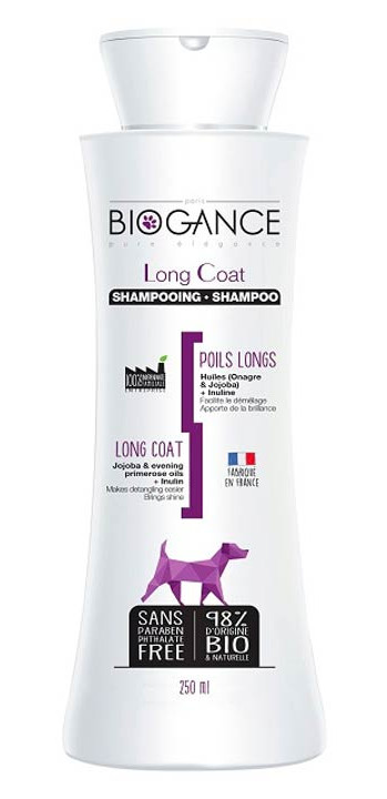 Speciální šampon pro dlouhosrsté psy Biogance Long Coat zajišťuje intenzivní výživu a optimální ochranu před cucháním srsti.