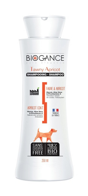 Šampon Biogance Tawny Apricot pro psy s blond, žlutou, zlatou, žlutohnědou a meruňkovou barvou srsti. Tawny Apricot šampon obsahuje mrkvový olej a hennu, posilující a zjemňující srst.