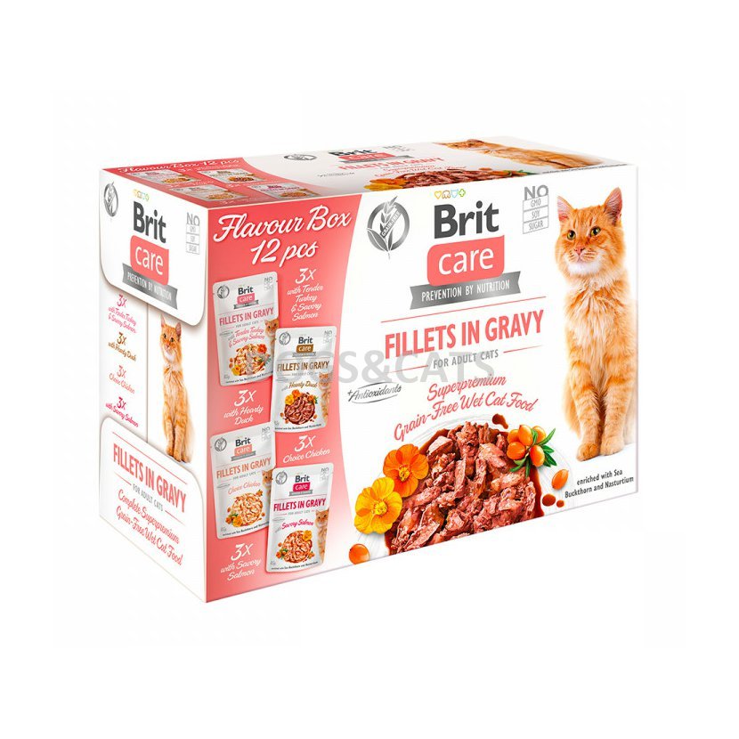 Brit Care kapsičky Adult in Gravy jsou filetky ve šťávě obohacené o rakytník a lichořeřišnici. Kompletní bezobilné krmivo pro dospělé kočky.