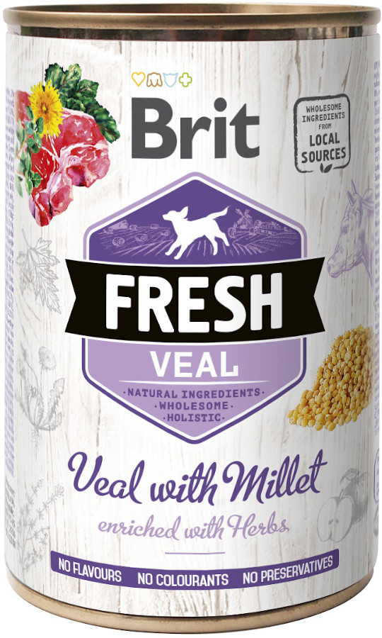 Telecí s prosem. Brit Fresh nabízí delikátní, kompletní a vybalancovanou výživu s masem, orgány, zeleninou, ovocem a bylinkami z lokálních zdrojů. Vyrobeno z čerstvého masa, které v sobě přirozeně uchovává masovou šťávu obsahující látky, které zachovávají jedinečné chuťové vlastnosti produktu. Kompletní krmivo pro psy.
