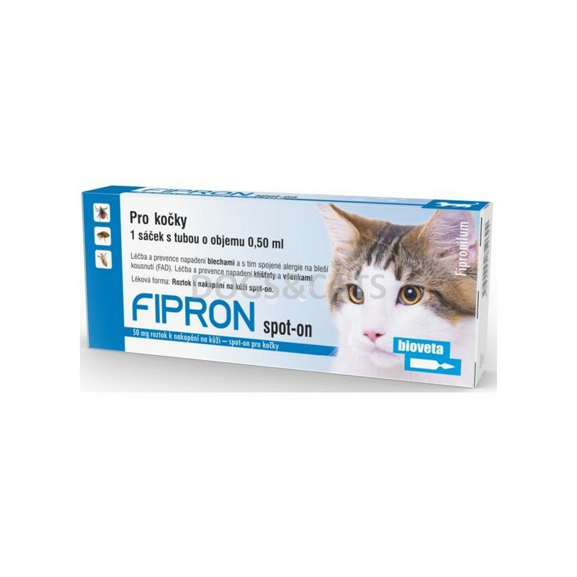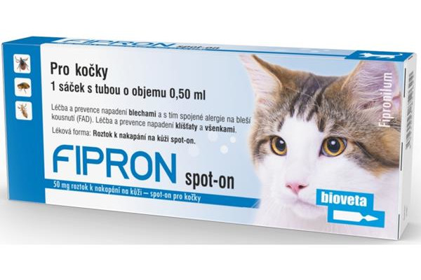 FIPRON 50 mg roztok pro nakapání na kůži – spot-on pro kočky k léčbě a prvenci napadení blechami a s tím spojené alergie na bleší kousnutí (FAD). Léčba a prevence napadení klíšťaty a všenkami.
