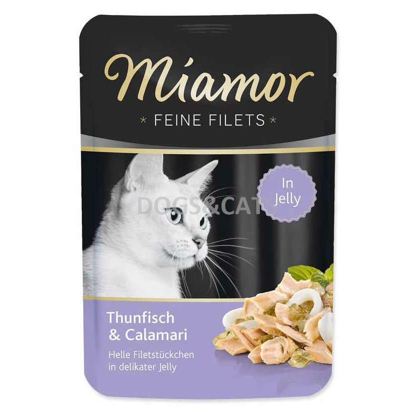 Miamor chutné a lehce stravitelné filety TUŇÁK/KALAMÁRY s nízkým obsahem tuku pro dospělé kočky, seniory a jedince s nadváhou. Mimor Fine Filets jsou kapsičky s tenkými plátky masa v delikátním želé vyrobené z vysoce kvalitních surovin. Filety se připravují výhradně z kousků světlého masa v delikátním rosolu zjemněném vysoce kvalitními přísadami, je zcela bez jater a vnitřností.
