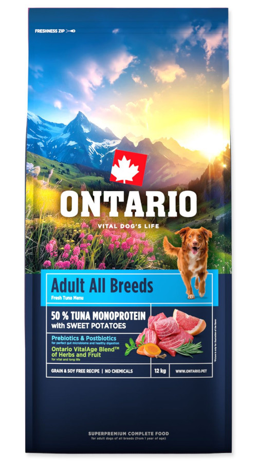 Čerstvý tuňák (26%), dehydrovaná bílkovina z tuňáka (24%), sladké brambory (12%), červená čočka (10%), bramborový škrob (8%), tuk z drůbeže (konzervovaný přírodními tokoferoly) (6%), sušené řepné řízky (3%), přírodní rostlinné aroma (2,5%), kvasnice, sušený kořen čekanky (2%), lněné semínko (1%), minerální látky, lososový olej (0,5%), extrakt z yuccy schidigery (0,5%), cholin chlorid (0,2%), směs sušených bylin a rostlinných extraktů 0,15% (0,1% sušený tymián, rozmarýn a petržel, 0,05% Ontario VitalAge BlendTM (rostlinné extrakty z grapefruitu, kurkumy, hřebíčku a rozmarýnu)), mannan-oligosacharidy (Active MOS 0,1%), chondroitin sulfát (270 mg/kg), glukosamin sulfát (200 mg/kg), Lacticaseibacillus paracasei HA - 108 inaktivovaný (7,5 x 10^9 buněk/kg).
