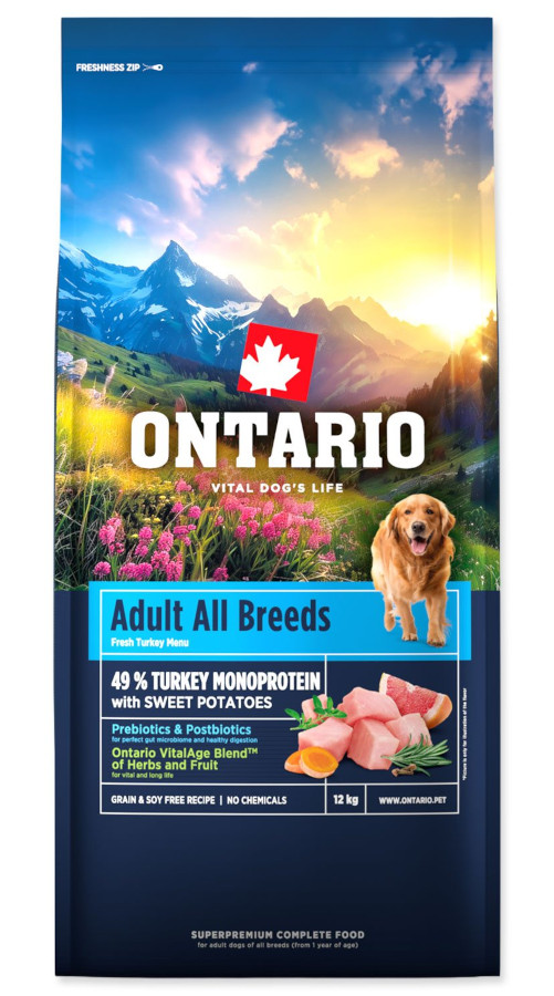 Čerstvé krůtí (26%), dehydrovaná krůtí bílkovina (23%), sladké brambory (13%), červená čočka (11%), bramborový škrob (8%), tuk z drůbeže (konzervovaný přírodními tokoferoly) (5%), sušené řepné řízky (3%), přírodní rostlinné aroma (2,5%), kvasnice, sušený kořen čekanky (2%), lněné semínko (1%), minerální látky, lososový olej (0,5%), extrakt z yuccy schidigery (0,5%), monokalciumfosfát, cholin chlorid (0,2%), směs sušených bylin a rostlinných extraktů 0,15% (0,1% sušený tymián, rozmarýn a petržel, 0,05% Ontario VitalAge BlendTM (rostlinné extrakty z grapefruitu, kurkumy, hřebíčku a rozmarýnu)), mannan-oligosacharidy (Actvie MOS 0,1%), chondroitin sulfát (270 mg/kg), glukosamin sulfát (200 mg/kg), Lacticaseibacillus paracasei HA - 108 inaktivovaný (7,5 x 10^9 buněk/kg).