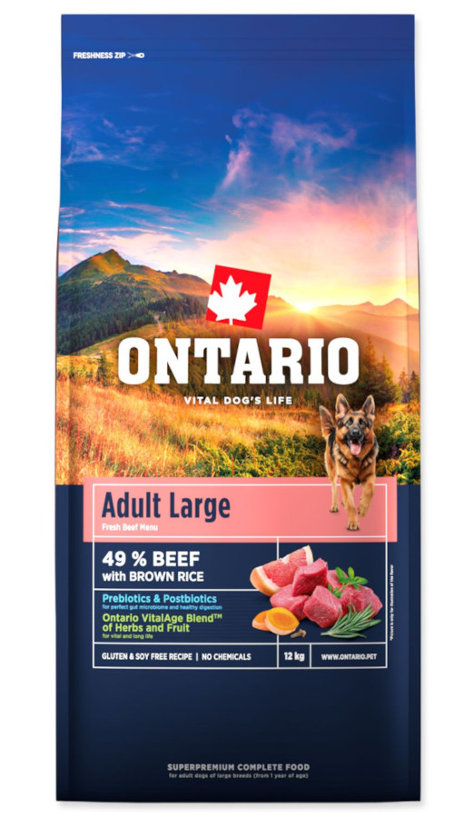Ontario Adult pro velká plemena, hovězí s hnědou rýží pro vitalitu a zdravou kondici.
