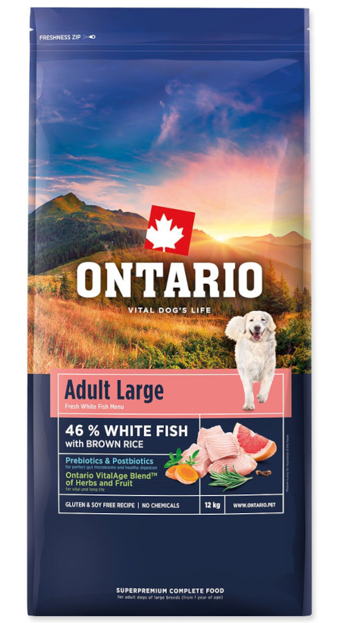 Ontario Adult pro velká plemena - bílá ryba s hnědou rýží pro pro vitalitu, lehké trávení a kondici. Superprémiové kompletní krmivo pro dospělé psy velkých plemen od 1 roku věku.