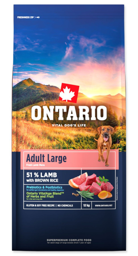 Ontario Adult pro velká plemena jehněčí s hnědou rýží pro citlivé zažívání a vitalitu.
