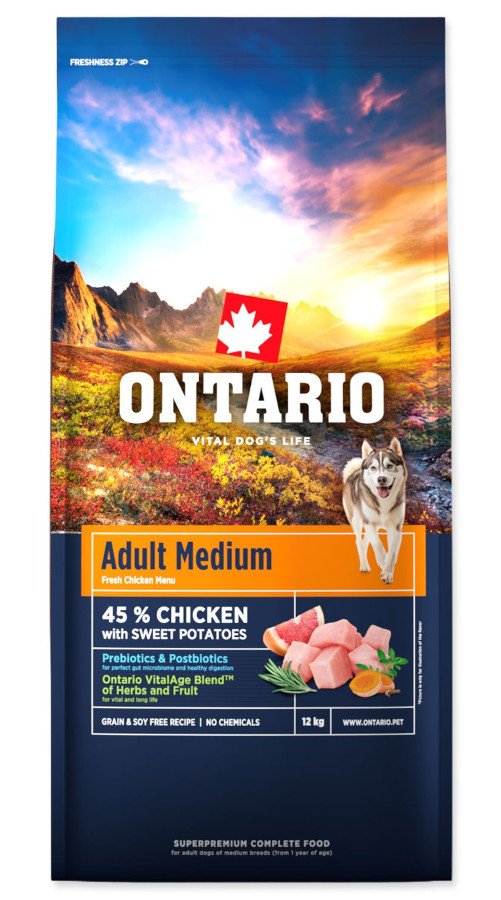 Čerstvé kuřecí (26%), dehydrovaná kuřecí bílkovina (19%), sladké brambory (14%), červená čočka (8%), bramborový škrob (7%), tuk z drůbeže (konzervovaný přírodními tokoferoly) (5,5%), dehydrovaná krůtí bílkovina (5%), sušené řepné řízky (3%), hydrolyzovaná játra (2,5%), kvasnice, sušený kořen čekanky (2%), lněné semínko (1%), minerální látky, lososový olej (0,5%), extrakt z yuccy schidigery (0,5%), cholin chlorid (0,2%), směs sušených bylin a rostlinných extraktů 0,15% (0,1% sušený tymián, rozmarýn a petržel, 0,05% Ontario VitalAge BlendTM (rostlinné extrakty z grapefruitu, kurkumy, hřebíčku a rozmarýnu)), mannan-oligosacharidy (Active MOS 0,1%), chondroitin sulfát (270 mg/kg), glukosamin sulfát (200 mg/kg), Lacticaseibacillus paracasei HA - 108 inaktivovaný (7,5 x 10^9 buněk/kg).