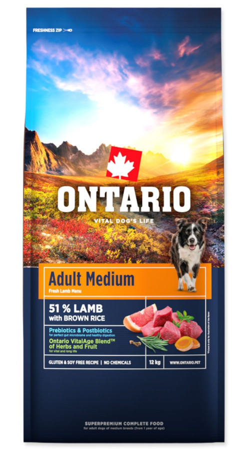 Čerstvé jehněčí (26%), dehydrovaná jehněčí bílkovina (25%), hnědá rýže (23,5%), tuk z drůbeže (8%), červená čočka (4%), hrachový protein (4%), lněné semínko (3%), sušené jablečné řízky (3%), hydrolyzované kvasnice (2%), lososový olej (1%), minerální látky (0,4%), hrachová mouka (0,1%), mannan-oligosacharidy (0,015%), frukto-oligosacharidy (0,012%), Mojave yucca (0,01%), Lactobacillus helveticus HA – 122 inaktivovaný (15 x 10^9 buněk/kg), směs sušených bylin a rostlinných extraktů 0,035% (0,01% sušená petržel a tymián, 0,025% Ontario VitalAge BlendTM (rostlinné extrakty z grapefruitu, kurkumy, hřebíčku a rozmarýnu)).
