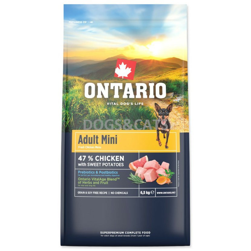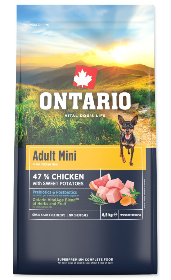 Čerstvé kuřecí (26%), dehydrovaná kuřecí bílkovina (21%), sladké brambory (13%), červená čočka (8%), bramborový škrob (7%), drůbeží tuk (konzervovaný přírodními tokoferoly) (6%), dehydrovaná krůtí bílkovina (4%), sušené řepné řízky (3%), hydrolyzovaná játra (2,5%), kvasnice, sušený kořen čekanky (2%), lněné semínko (1%), minerální látky, lososový olej (0,5%), extrakt z yuccy schidigery (0,5%), cholin chlorid (0,2%), směs sušených bylin a rostlinných extraktů 0,15% (0,1% sušený tymián, rozmarýn a petržel, 0,05% Ontario VitalAge Blend (rostlinné extrakty z grapefruitu, kurkumy, hřebíčku a rozmarýnu)), mannan-oligosacharidy (Active MOS 0,1%), chondroitin sulfát (270 mg/kg), glukosamin sulfát (200 mg/kg), Lacticaseibacillus paracasei HA - 108 inaktivovaný (7,5 x 10^9 buněk/kg).