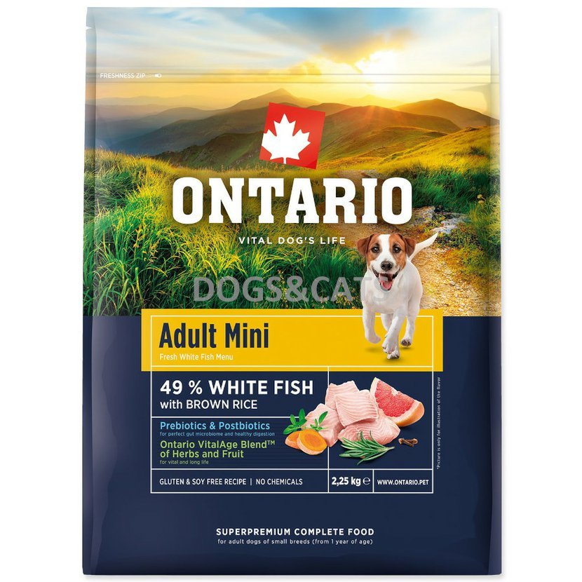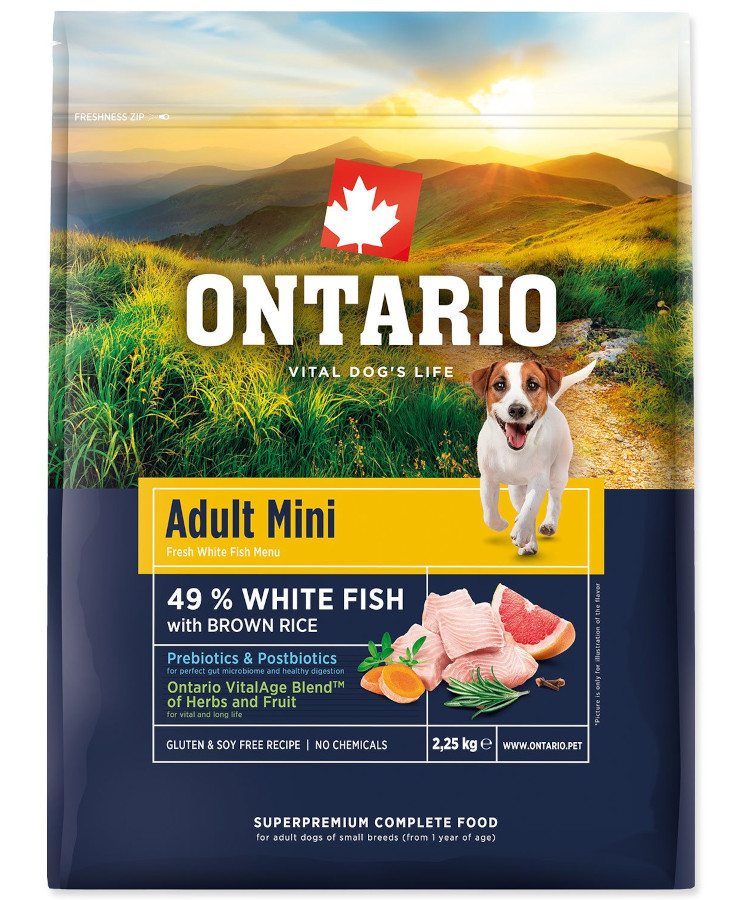 čerstvá bílá ryba (26%), dehydrovaná bílkovina z bílé ryby (23%), červená čočka (11%), hnědá rýže (9%), lámaná rýže (8%), tuk z drůbeže (konzervovaný přírodními tokoferoly) (7%), sušené řepné řízky (3%), hydrolyzovaná játra (2,5%), kvasnice, hrachový protein, sušený kořen čekanky (2%), lněné semínko (1%), minerální látky, lososový olej (0,5%), extrakt z yuccy schidigery (0,5%), cholin chlorid (0,2%), směs sušených bylin a rostlinných extraktů 0,15% (0,1% sušený tymián, rozmarýn a petržel, 0,05% Ontario VitalAge BlendTM (rostlinné extrakty z grapefruitu, kurkumy, hřebíčku a rozmarýnu)), mannan-oligosacharidy (Active MOS 0,1%), chondroitin sulfát (270 mg/kg), glukosamin sulfát (200 mg/kg), Lacticaseibacillus paracasei HA - 108 inaktivovaný (7,5 x 10^9 buněk/kg).
