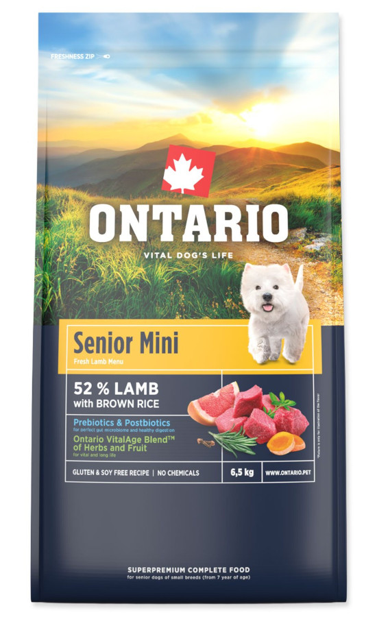 Čerstvé jehněčí (26%), dehydrovaná jehněčí bílkovina (26%), hnědá rýže (24,5%), sušené jablečné řízky (6%), tuk z drůbeže (5%), hrachový protein (3%), červená čočka (3%), lněné semínko (3%), hydrolyzované kvasnice (2%), lososový olej (1%), minerální látky (0,4%), hrachová mouka (0,1%), mannan-oligosacharidy (0,015%), frukto-oligosacharidy (0,012%), Mojave yucca (0,01%), Lactobacillus helveticus HA – 122 inaktivovaný (15 x 10^9 buněk/kg), směs sušených bylin a rostlinných extraktů 0,035% (0,01% sušená petržel a tymián, 0,025% Ontario VitalAge BlendTM (rostlinné extrakty z grapefruitu, kurkumy, hřebíčku a rozmarýnu)).