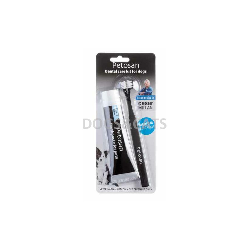 Petosan je první výrobce, který dodává kartáčky pro psy v různých velikostech. Sada pro psy střední velikosti obsahuje dvouhlavý zubní kartáček a pastu s kuřecí příchutí 70 g.