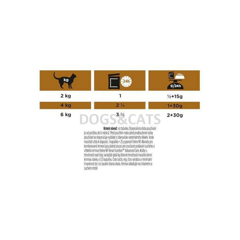 Doporučená doba používání je od počátku do 6 měsíců. Před použitím nebo před prodloužením doby používání se doporučuje vyžádat si stanovisko veterinárního lékaře. Voda musí být vždy k dispozici. 1 kapsička = 25 g granulí Feline NF. Návody pro kombinované krmení jsou platné pouze pro současné podávání suchého a vlhkého krmiva Feline NF Renal Function™ Advanced Care. Kočky s hmotností nad 6 kg: na každý další kg tělesné hmotnosti navyšte denní krmnou dávku o 1/2 kapsičky.