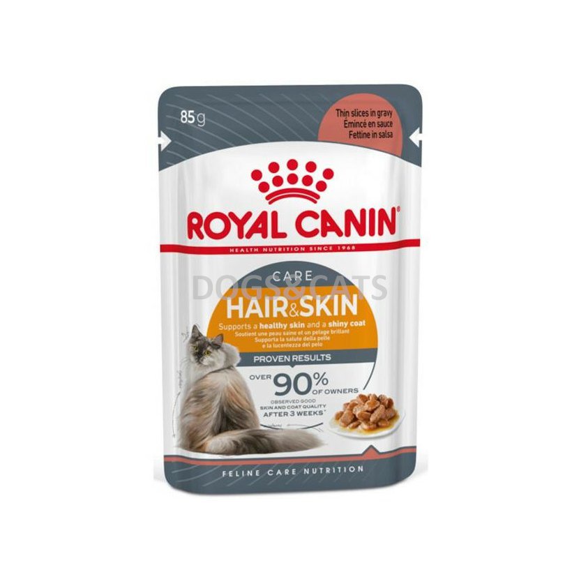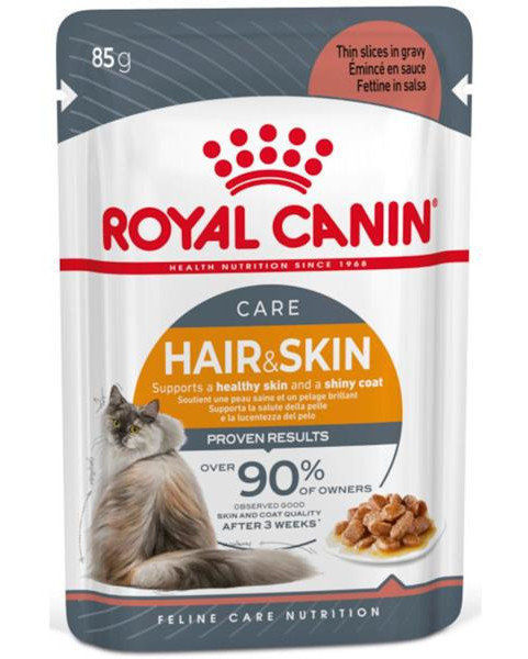 Royal Canin Hair and Skin je kompletní krmivo pro dospělé kočky ve formě chutných kousků ve šťávě. Podporuje zdraví kůže a lesk srsti dospělých koček.