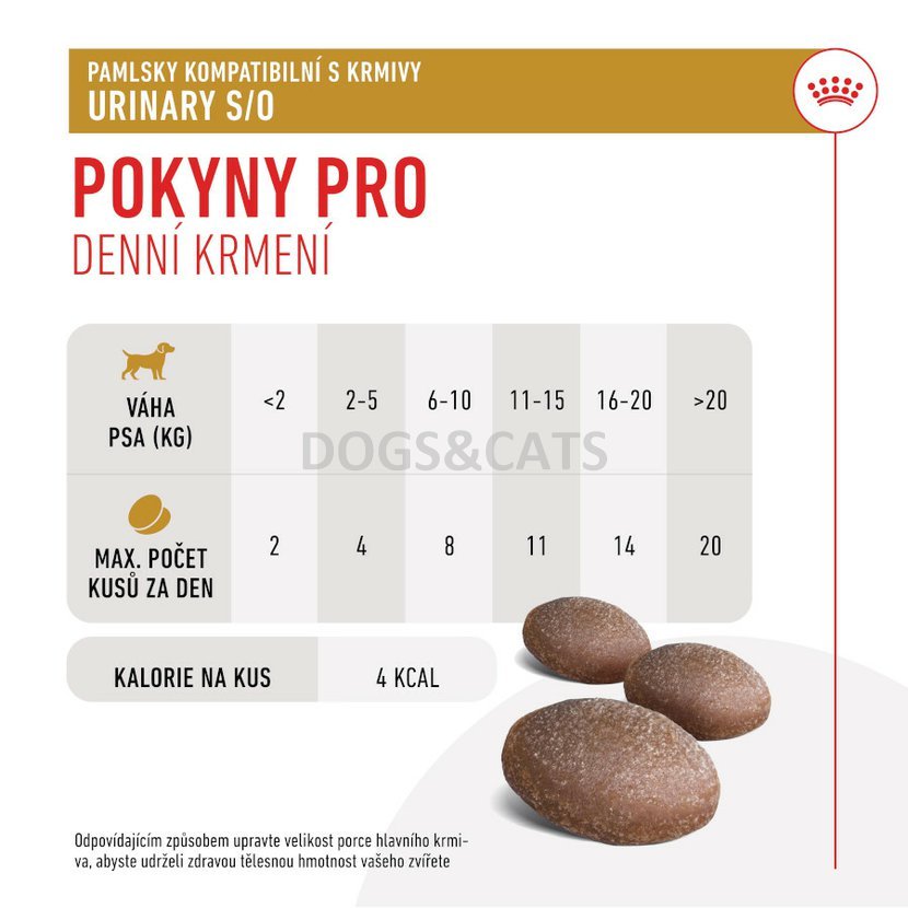 Užijte si chvíle se svým psem a těmito chutnými dobrotami. Pokud jde o zdraví a pohodu vašeho psa, víme, že chcete jen to nejlepší. Proto jsme vytvořili Pamlsky ROYAL CANIN® Urinary S/O, abyste mohli odměňovat svého psa, aniž byste narušovali zdravotní přínosy jeho pečlivě vyváženého dietního plánu. Vyvinuto odborníky na psí výživu. Tyto měkké žvýkací pamlsky jsou vhodné pro dospělé psy. Pamlsky ROYAL CANIN® Urinary S/O obsahují optimální množství minerálů, a proto jsou skvělou volbou pro psy konzumující urinární dietu. Když odměňujete svého psa Pamlsky ROYAL CANIN® Urinary S/O, nedáváte mu jen dobrotu, aktivně podporujete jeho veterinární dietní plán. Řiďte se pokyny ke krmení na balení a nedávejte svému psovi více pamlsků, než je doporučeno. Když odměňujete svého psího společníka, doporučujeme vhodně upravit velikost porce jeho hlavního jídla, aby si zachoval zdravou váhu.