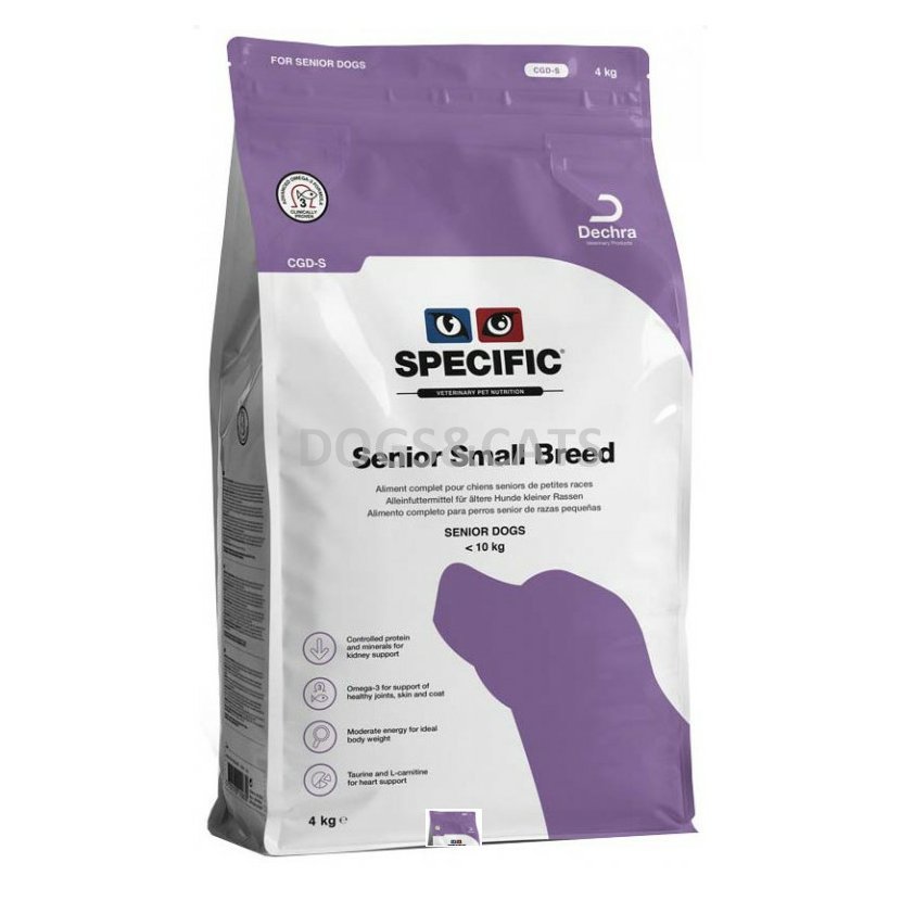 Specific CGD-S Senior Small je speciální vysoce chutná výživa se zvýšeným obsahem vlákniny pro starší psy malých plemen (do 10ti kg) od 8 let věku pro zabránění či zpomalení vzniku geriatrických chorob a procesů spojených se stárnutím.