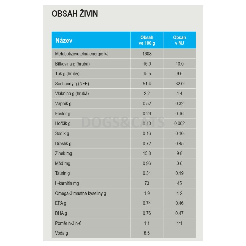 - Jedinečně vysoký obsah omega-3 mastných kyselin EPA a DHA původem z rybího oleje a krillu. U psů se srdečním onemocněním EPA přispívá k udržení svalové hmoty, chuti k jídlu, normálnímu srdečnímu rytmu, krevnímu tlaku a k normální agregaci krevních destiček. U psů se selháním ledvin pomáhají omega-3 mastné kyseliny zpomalovat jeho progresi.