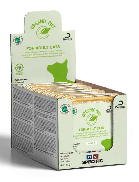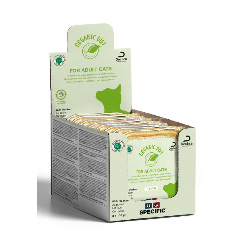SPECIFIC™ Organic s kuřecím masem je kompletní vyvážené krmivo pro dospělé kočky. Vysoce kvalitní a lehce stravitelné složky zajišťují optimální příjem živin a poskytují dospělé kočce všechny živiny nezbytné pro zdravý život. Díky nízkému obsahu sacharidů je SPECIFIC Organic také vhodné pro kočky s onemocněním cukrovky. Kočky s cukrovkou, které přejdou na SPECIFIC Organic, mohou zaznamenat sníženou potřebu inzulinu. Konzumace mokrého krmiva jako je SPECIFIC Organic s kuřecím masem zvyšuje u koček objem moči, což může pomoci jedincům s intersticiální cystitidou.