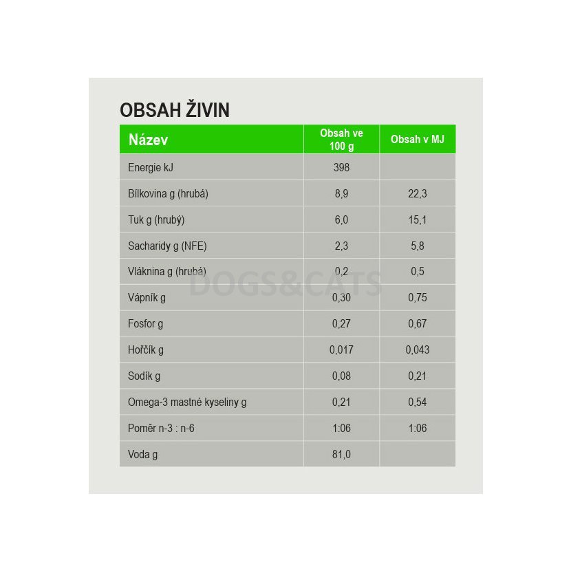 SLOŽENÍ Vepřové maso, hovězí maso, kuřecí maso (9,8 %), řepkový olej, minerální látky, rýže, vitamíny a stopové prvky. Neobsahuje žádné umělé antioxidanty, barviva ani zchutňovadla.