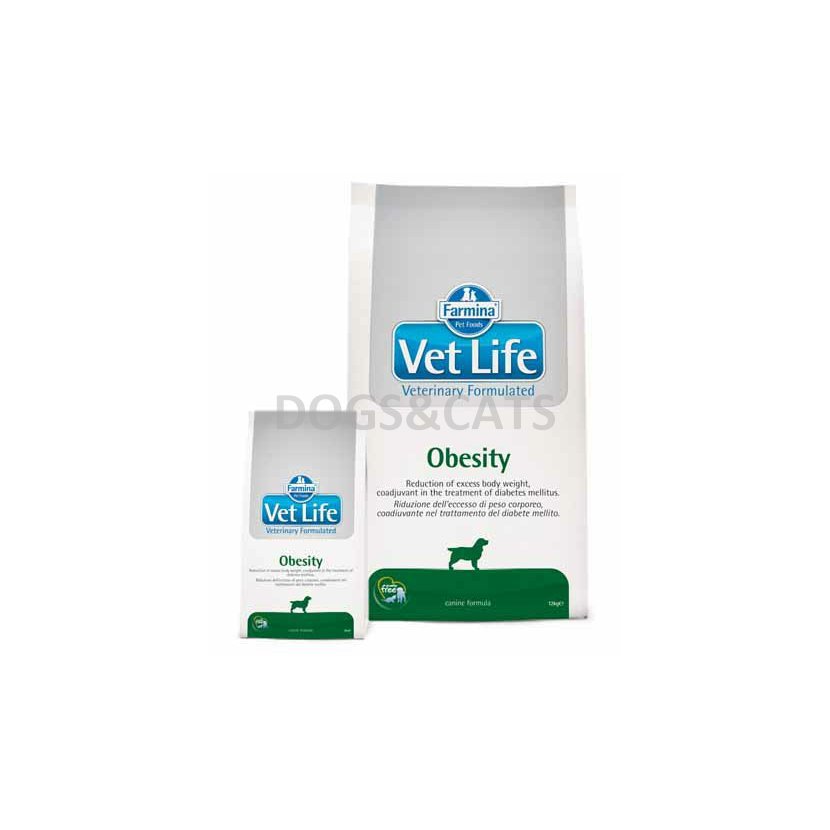 Veterinární dieta Vet Life Obesity canine formula díky svému složení přispívá ke snížení nadměrné tělesné hmotnosti psů a ke kontrole přísunu glukózy (Diabetes Mellitus).