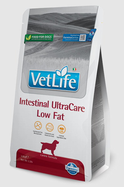 Vet Life Intestinal UltraCare Low Fat je kompletní dietetické krmivo pro dospělé psy určené pro podporu zažívání při střevních resorpčních onemocněních a pro kompenzaci maldigesce a exokrinní pankreatické nedostatečnosti.