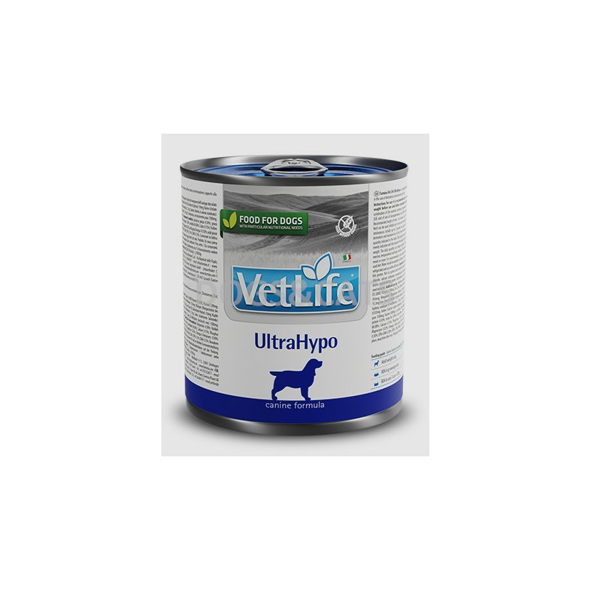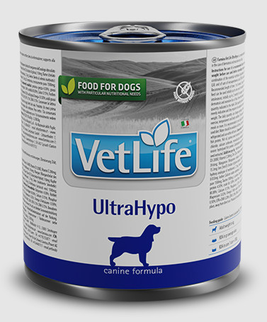 Vet Life UltraHypo je kompletní vlhké dietní krmivo určené ke snížení výskytu potravinových alergií a nesnášenlivostí u dospělých psů. Používá se i jako eliminační dieta. Podporuje také funkce kůže v případě kožních poruch a nadměrné ztráty srsti.