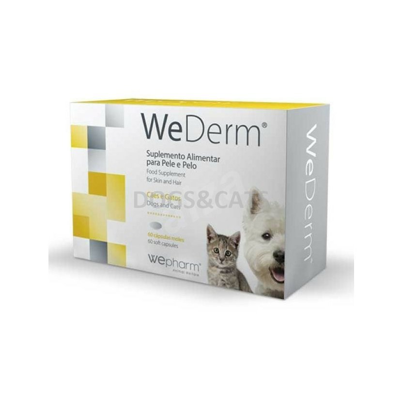 Výživový doplněk pro psy a kočky s vysokým obsahem esenciálních mastných kyselin, vitamínů a minerálů určených k podpoře kožní funkce v případech dermatózy, svědění, vypadávání chlupů nebo jakéhokoliv jiného dermatologického projevu alergie. WeDerm ® zaručuje synergický účinek s protizánětlivým účinkem, snižuje potřebu steroidů, snižuje zánět a svědění a zlepšuje bariérový účinek pokožky podporující posilování meziproduktových epidermálních ceramidových lipidových vrstev.